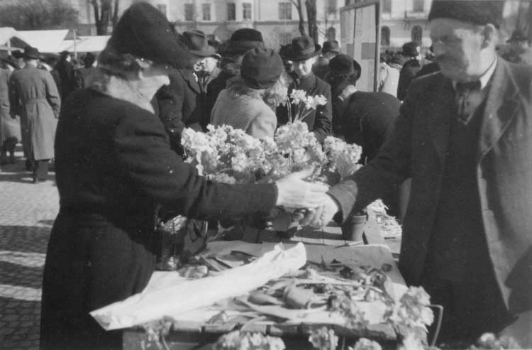 Det är torghandel på Västra Torget i Jönköping och en man köper blommor av en torggumma.