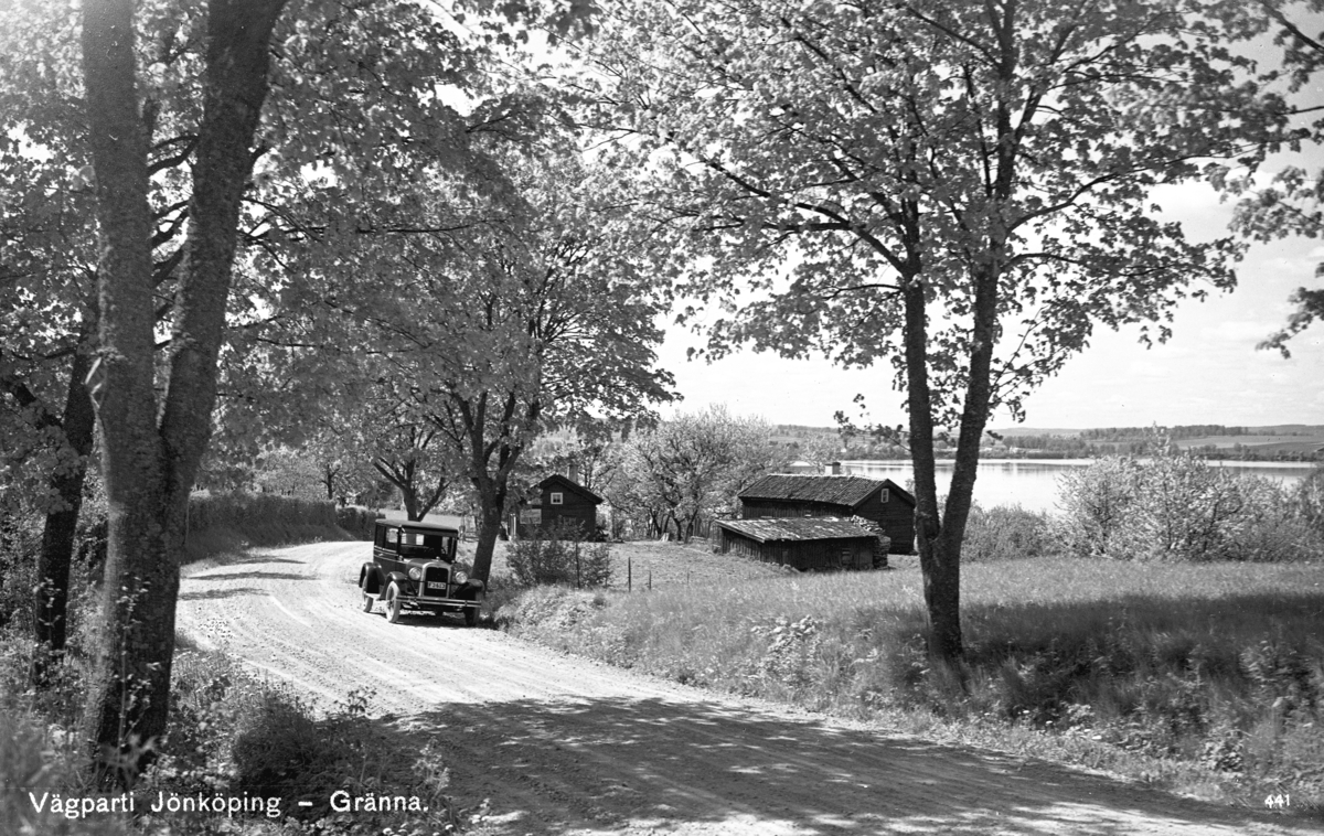 En bil på väg mot Gränna i närheten av Lyckås gård mellan Kaxholmen och Skärstad, med Landsjön i bakgrunden.