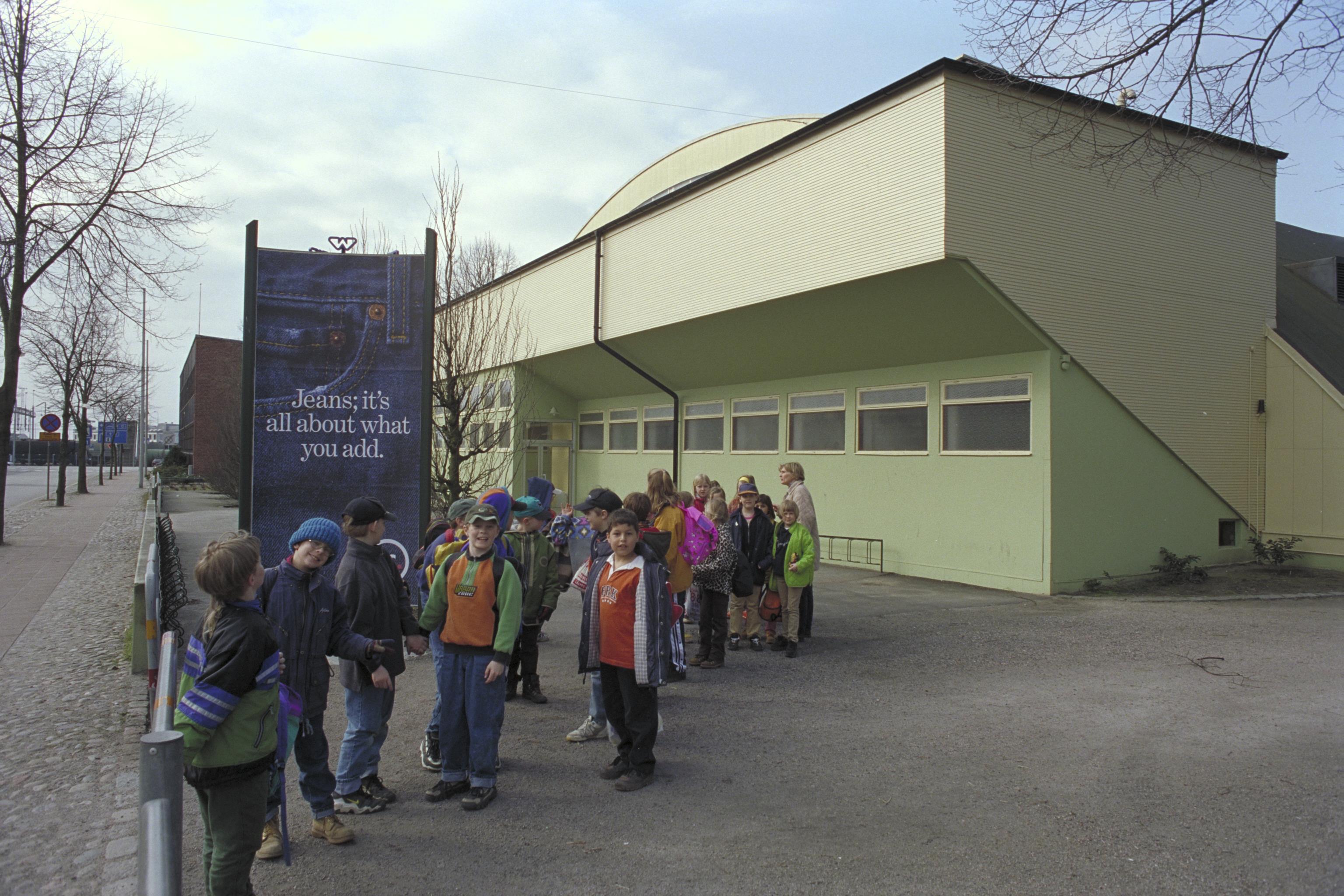 Sporthall, unga Ystadbor utanför byggnaden i funkisstil.