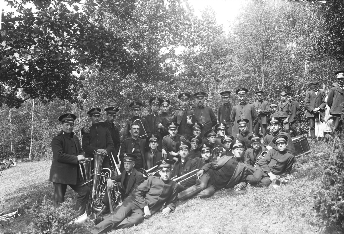 Frälsningsarméns musikkår har tagit en paus i sommarvärmen. Med sina instrument vilar de i skuggan av en stor ek, kanske i Huskvarnas stadspark.
