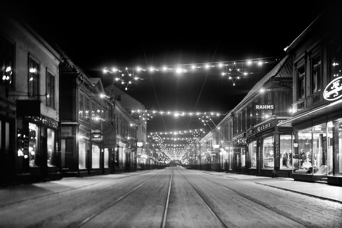 Julbelysning på Östra Storgatan i Jönköping med spårvagnsspår i förgrunden. Bilden är tagen från Hovrättstorget västerut.