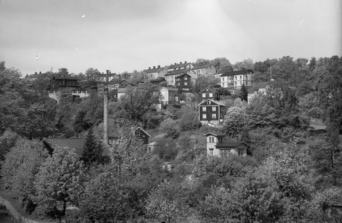Dunkehallaravinens norra sida, med husen klättrande uppåt mot Hallmansvägen i Jönköping. I mitten syns Jakobsdal, byggt som lusthus på 1850-talet.