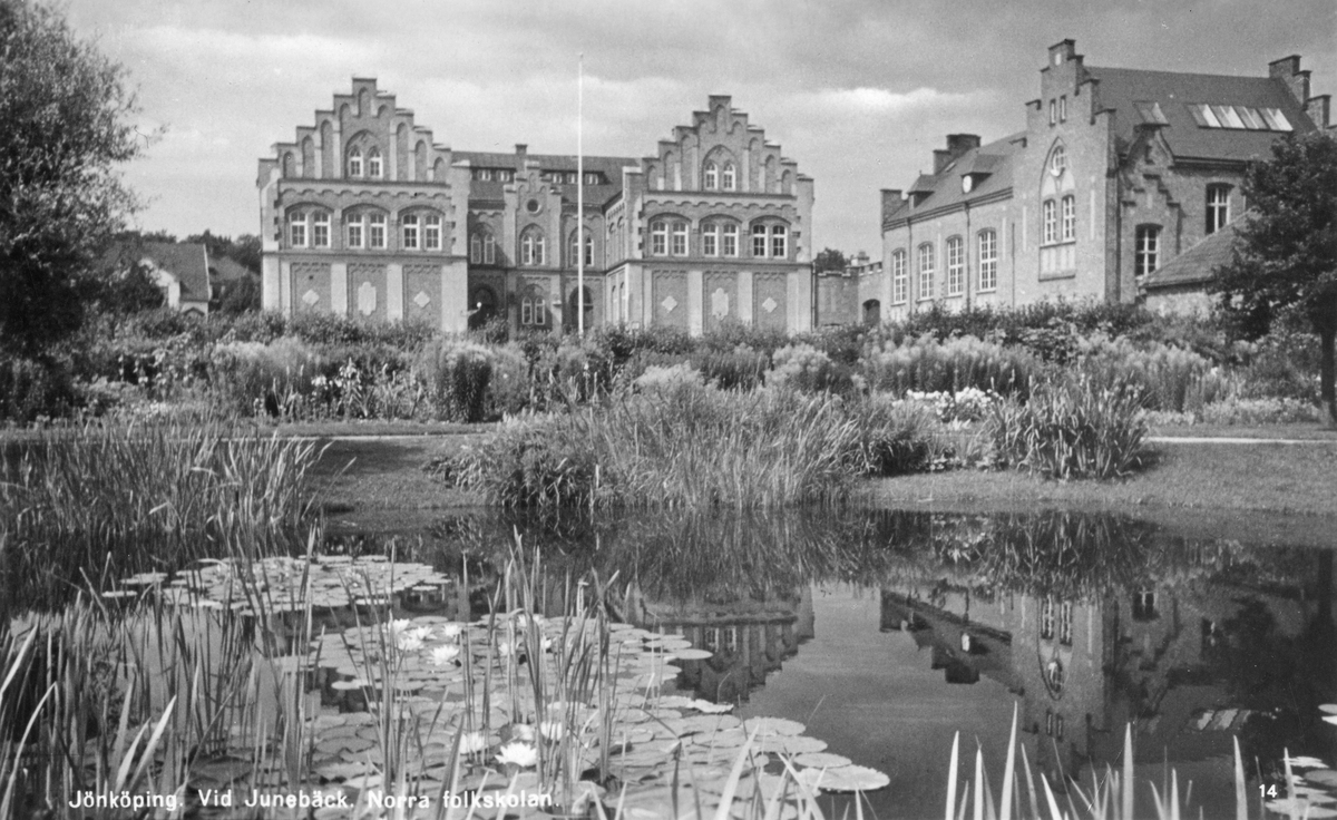 Talavidskolan, tidigare Norra folkskolan, i Jönköping med Junedammen i förgrunden.