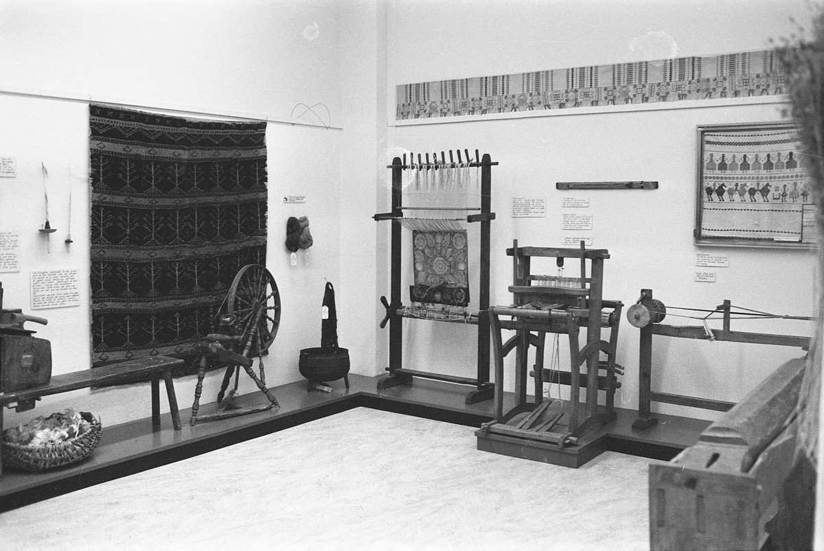 Jönköpings läns museum, utställningar. Textilavdelning med de redskap som behövdes för att förvandla råmaterial till de textilvaror man behövde.