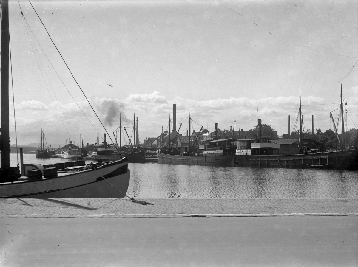 Från Vättern via kanalen kommer man in till Munksjön där båtarna kan förtöja i Inre hamnen. I bakgrunden syns skorstenen vid Munksjö pappersbruk.