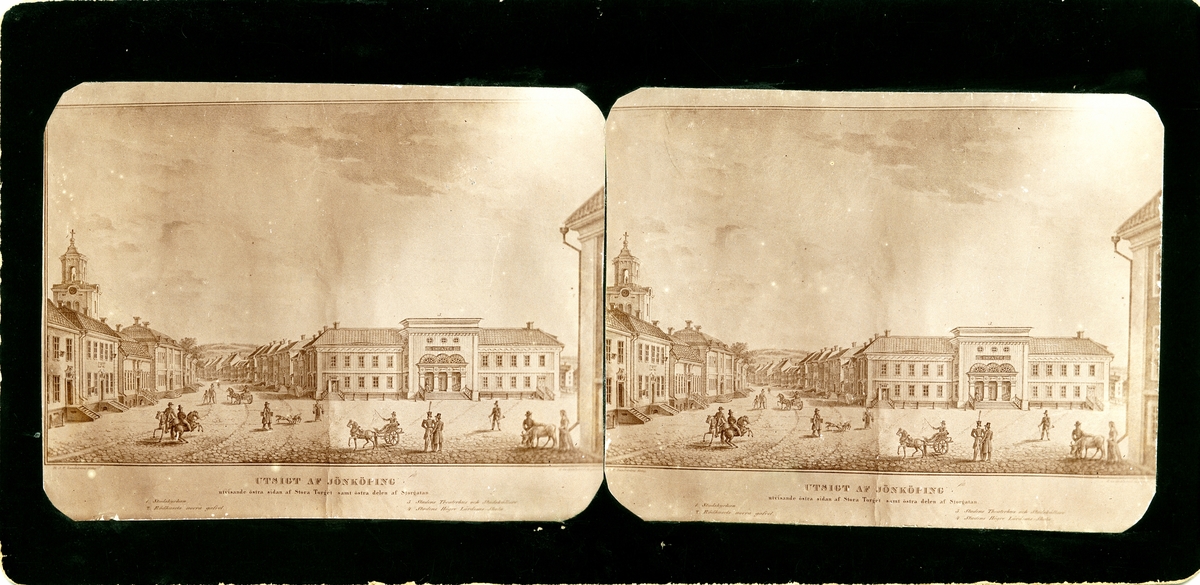 Jönköpings teater vid Hovrättstorget i Jönköping. Avfotograferad litografi av Gjötström och Magnusson efter teckning av E.F Martins 1837.