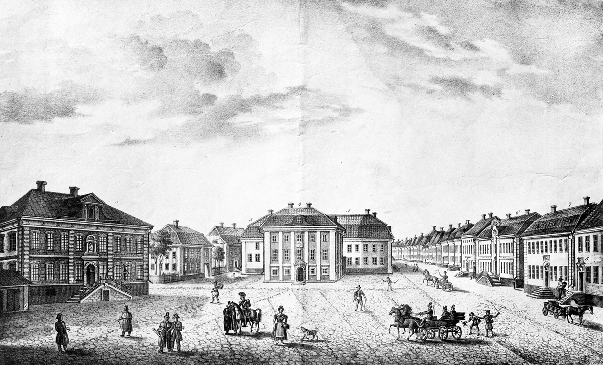 Litografi av Gjötström och Magnusson efter teckning av E.F Martins 1837. Östra Storgatan med de höga trapporna, Rådhuset och Göta Hovrätt i Jönköping.