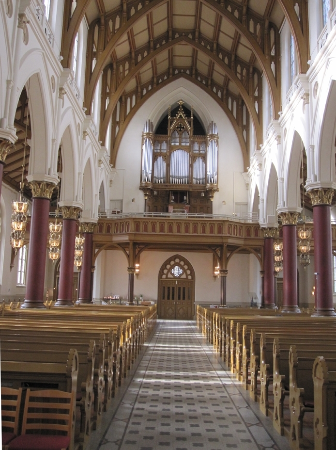 Interiör från Sofiakyrkan med fokus på den ommålade läktarorgeln.