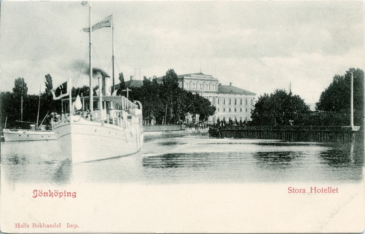 Hamnen i Jönköping med hamnkanalens utlopp i Vättern. Stora Hotellet syns i bakgrunden.