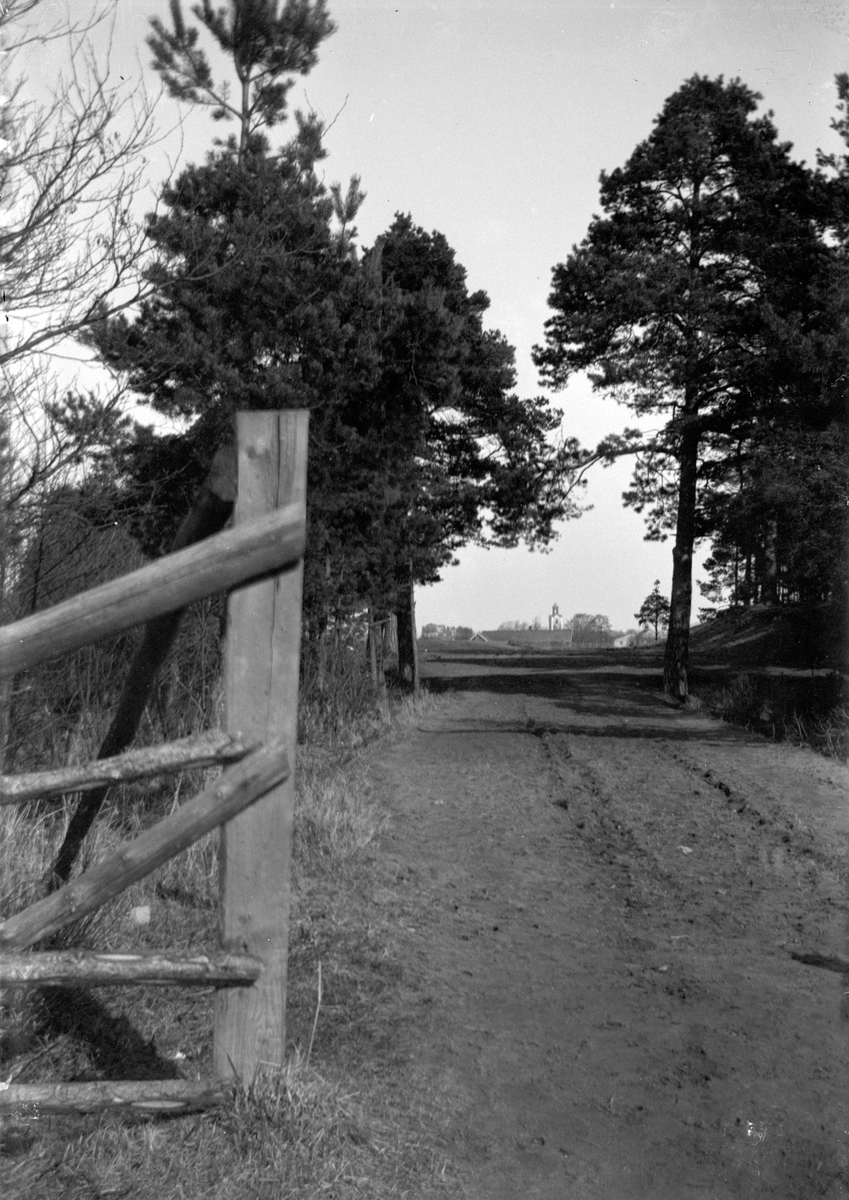 En grusväg går genom en tallskog. Till höger en grindstolpe och i bakgrunden syns en gård och ett kyrktorn.