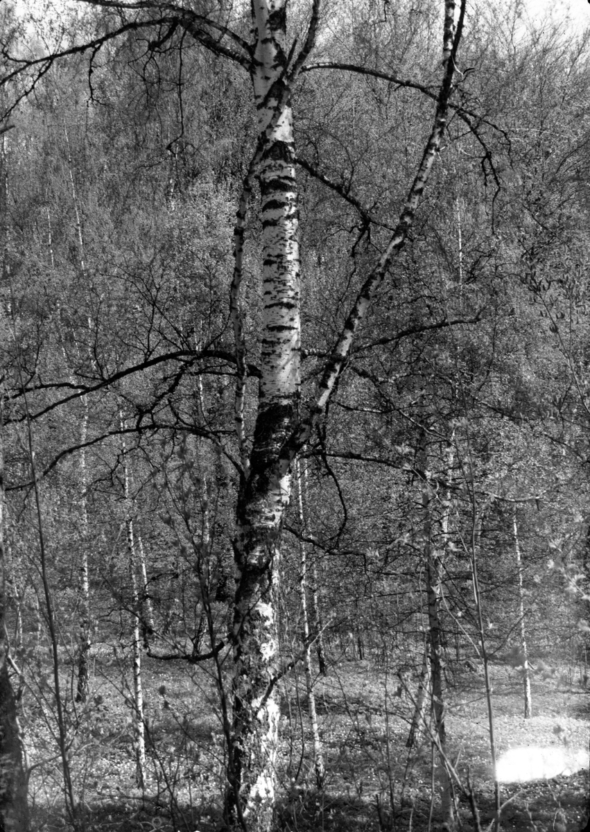 En björkdunge med vitsippor på marken.