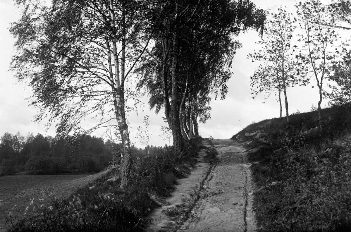 Uppför backen utmed åkern går en liten väg med träd vid sidan om.