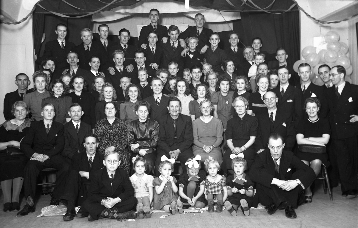 En gruppbild på män, kvinnor och barn i en samlingslokal.