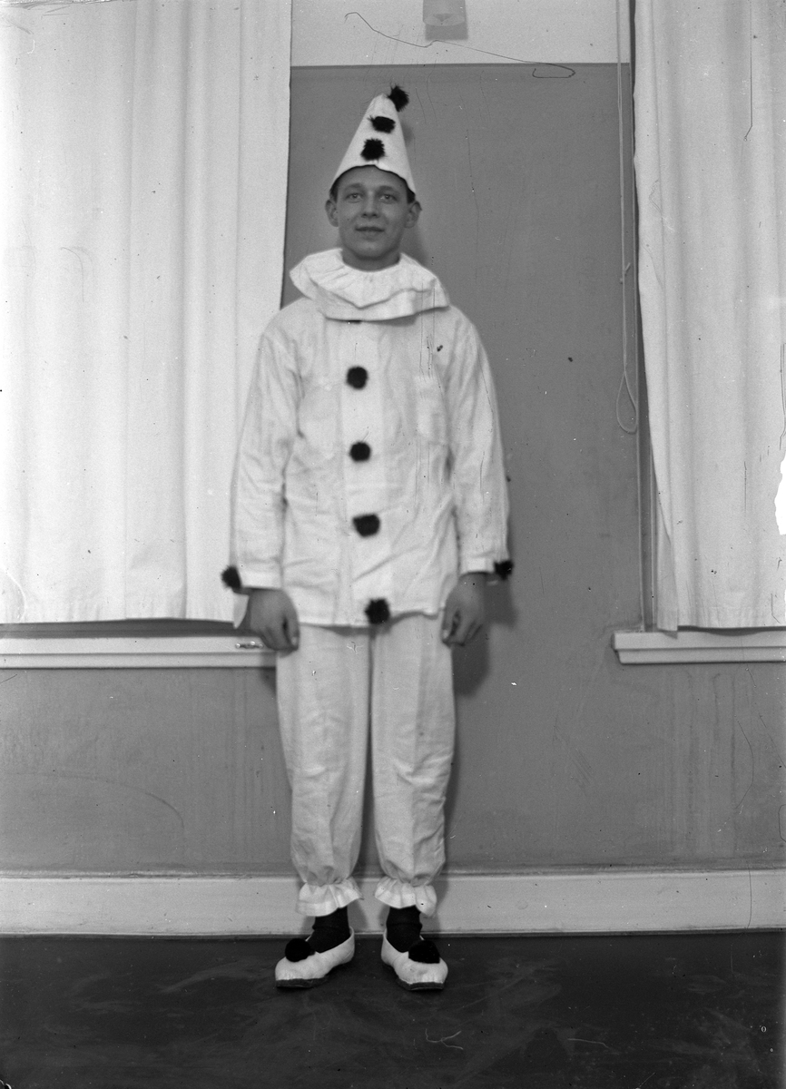 En man är utklädd i clownkostym. Lungkliniken i Eksjö.