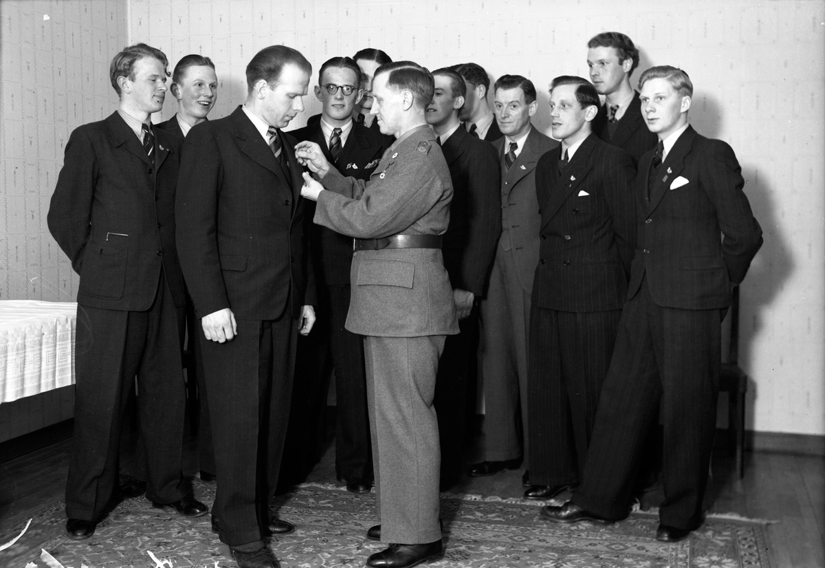 Gruppbild på män, varav en i uniform, som delar ut kavajslagsmärke.