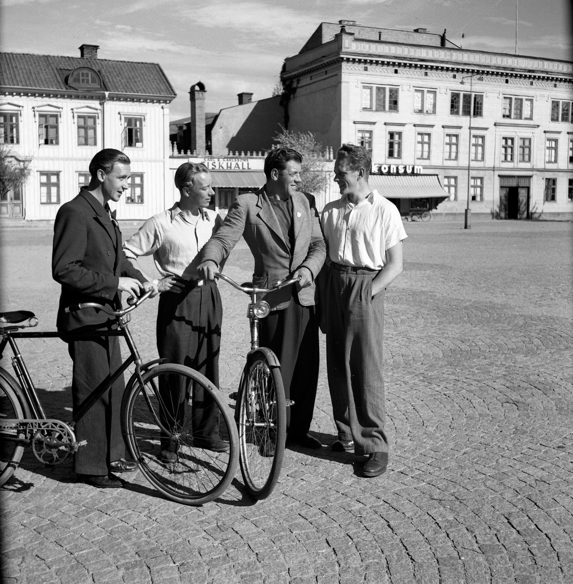 På Östra torget i Jönköping står fyra män med två cyklar. De två i mitten är från vänster Gösta Fröding och Olle Lindberg. I bakgrunden syns Amerikahuset.