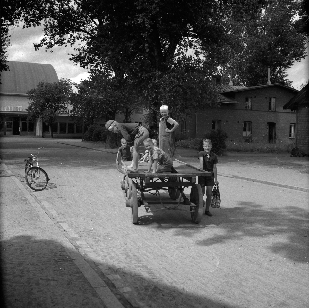 Barn på en kärra på Oxtorgsgatan i Jönköping. Bilden är tagen från öster mot Idrottshuset som tillfälligt utnyttjas som vandrarhem.