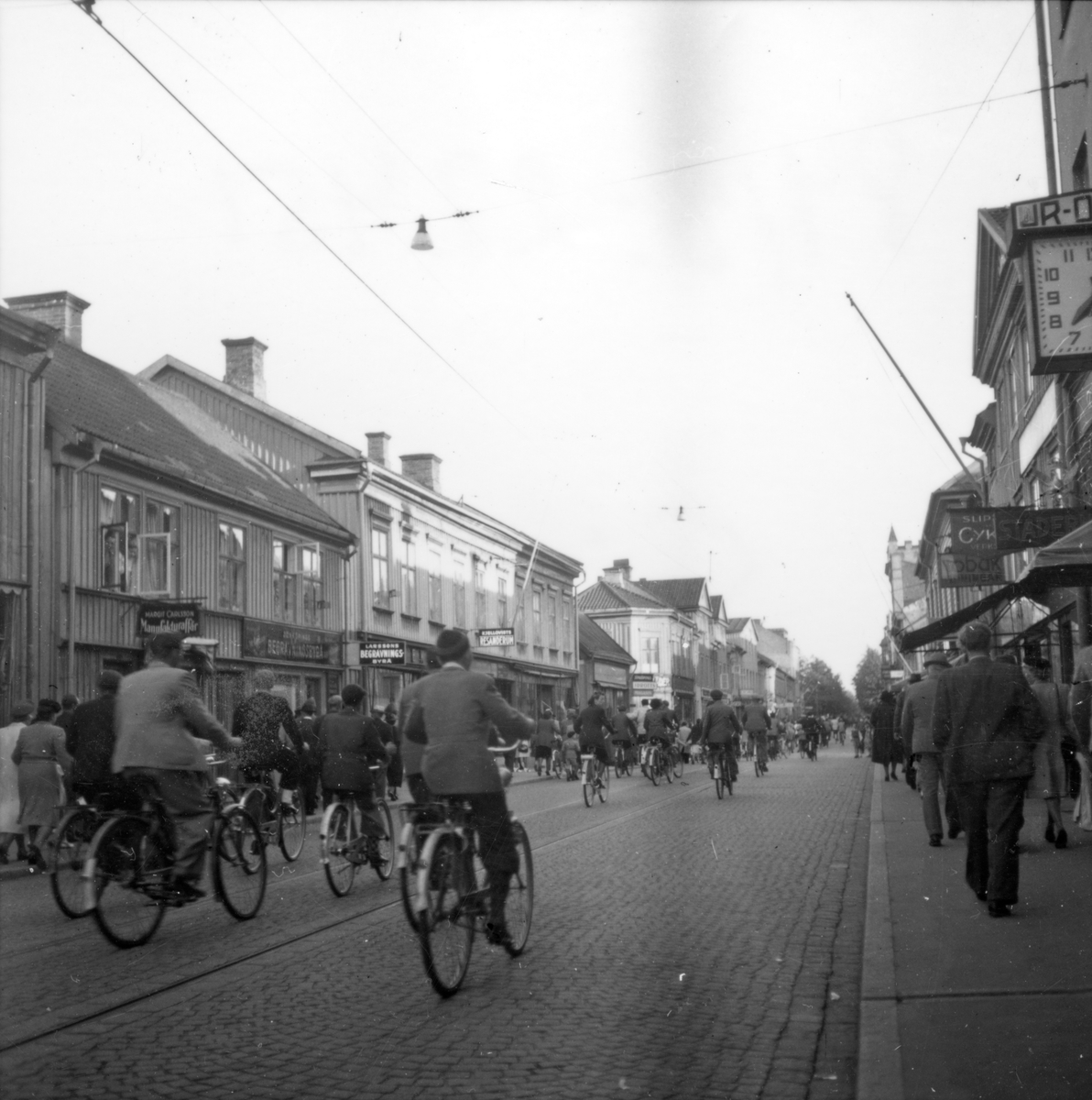 Cyklister på Barnarpsgatan söderut i Jönköping. Förmodligen ett motionslopp anordnat av Jönköpings Cykelklubb.