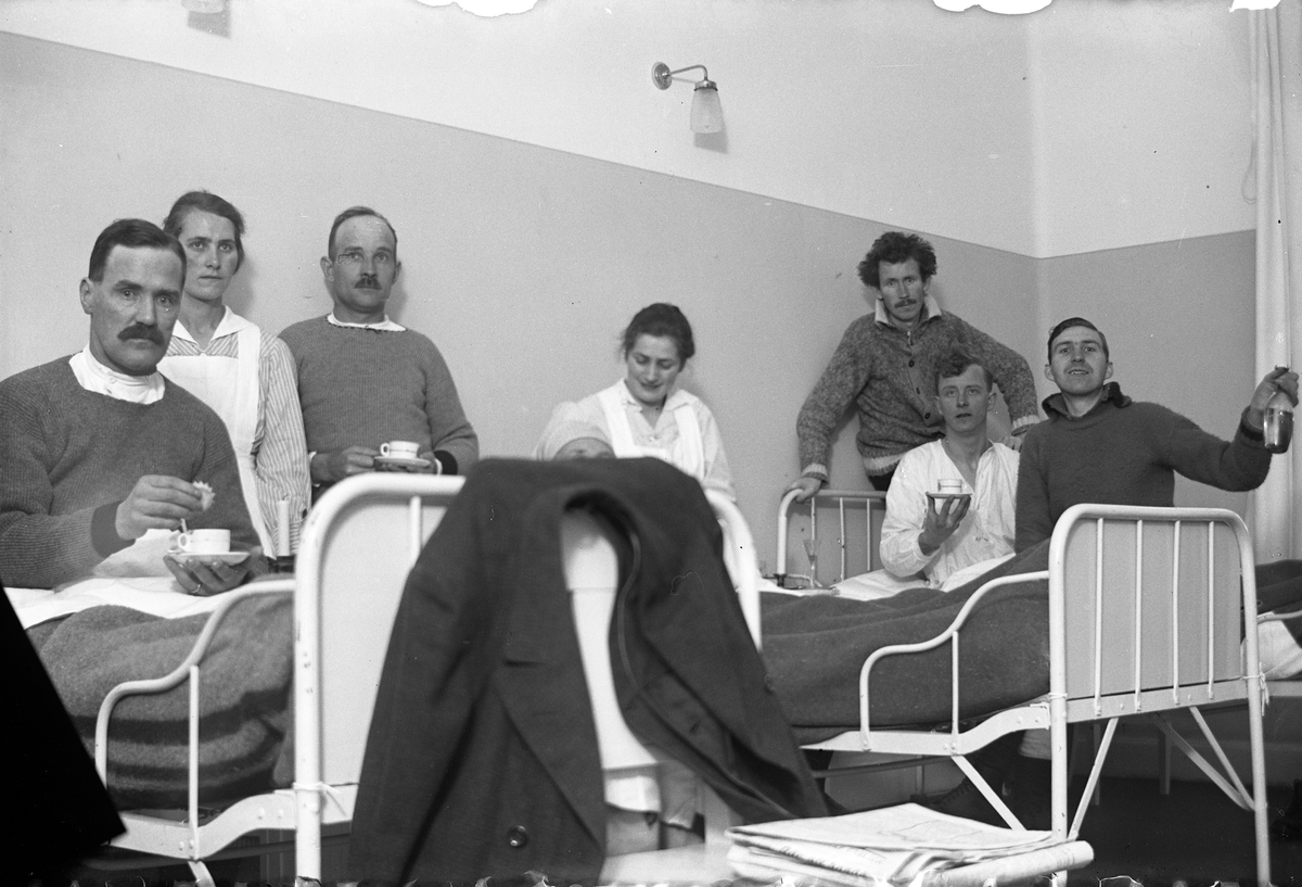 Fem män och tre kvinnor i och vid tre sjukhussängar på Lungkliniken, Eksjö.