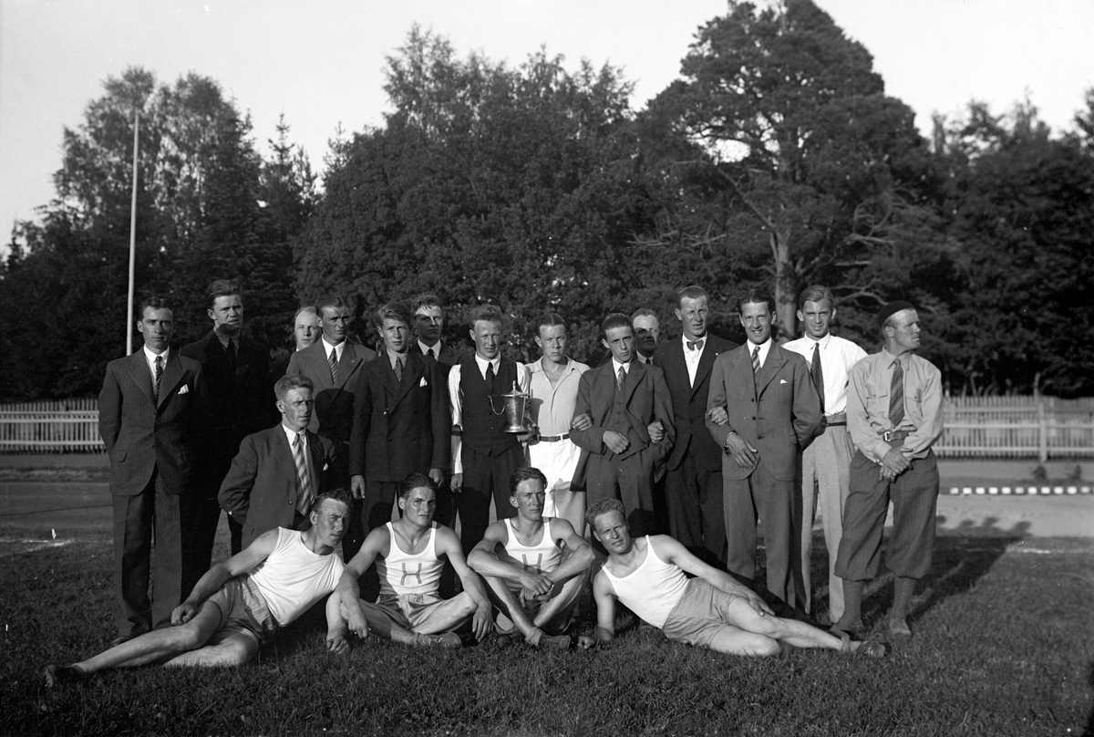 Gruppbild med idrottsklädda män i förgrunden, H (Hallby) på tröjan. Mannen som står i mitten håller i en pokal.