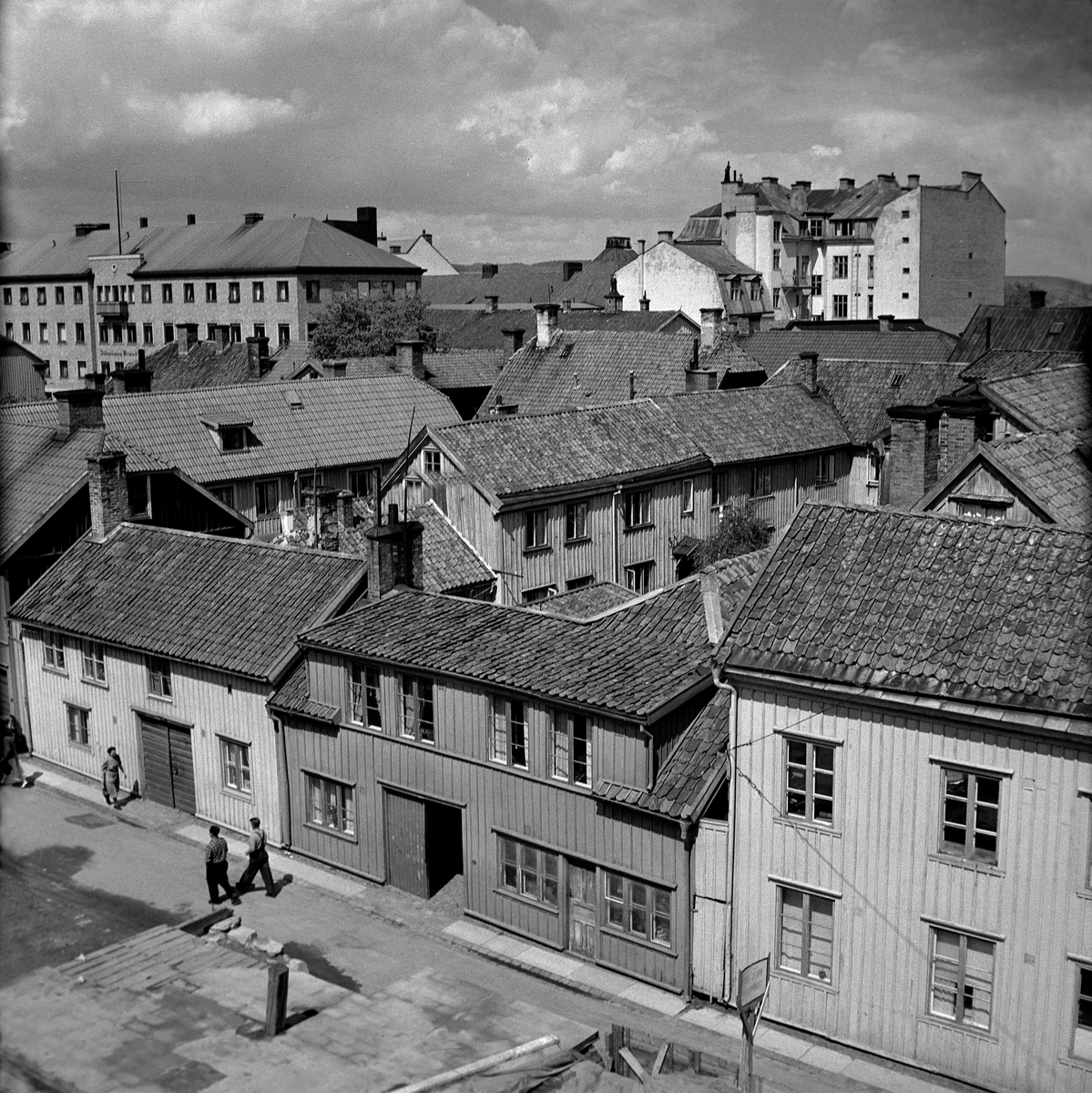Nordöstra delen av Kanalgatan i Jönköping. I bakgrunden ser man Allmänna Brand och det höga huset ligger vid Norra Strandgatan.