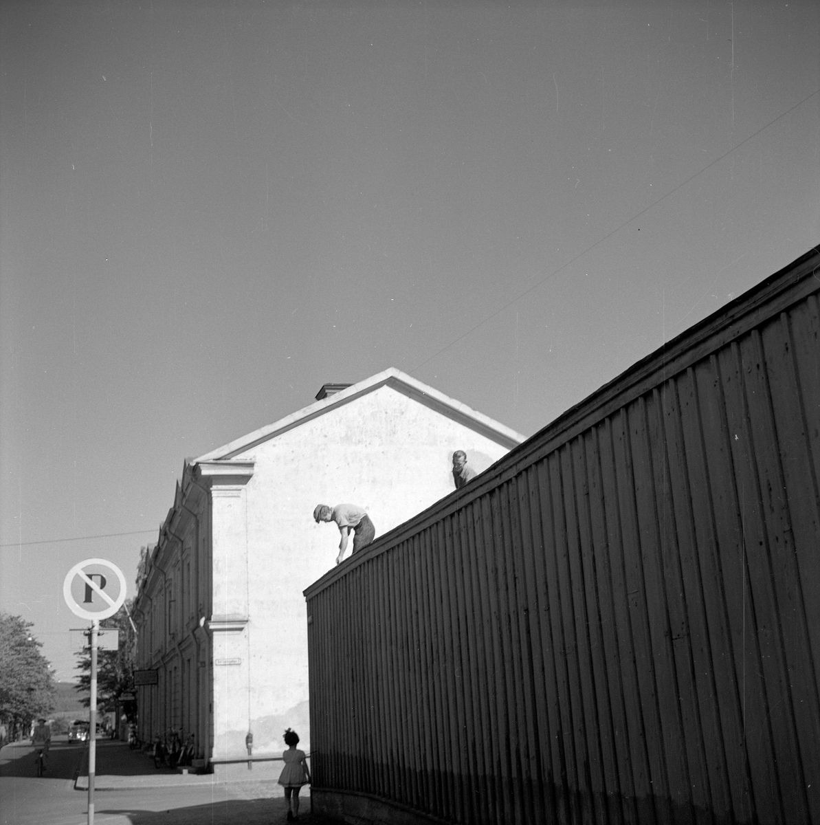 En gata i Jönköping med en skylt "Parkering förbjuden". En liten flicka står på trottoaren vid ett plank där två män arbetar.
