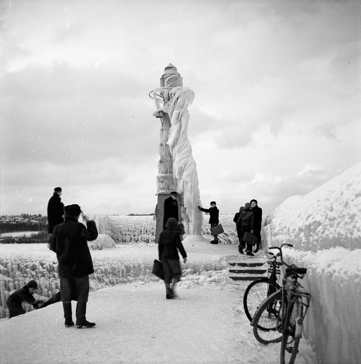 Människor ute på hamnpiren i Jönköping vid en nedisad fyr.