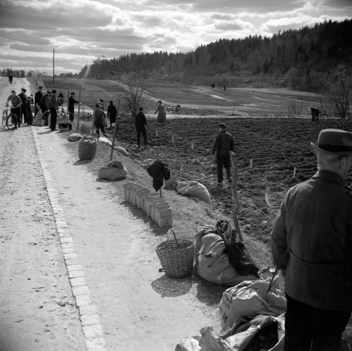 Vid Lovisagatan i Jönköping är det potatissättning på våren. Säckar och korgar står utmed dikeskanten och både barn och vuxna arbetar. Till höger syns Ulricehamnsbanan.