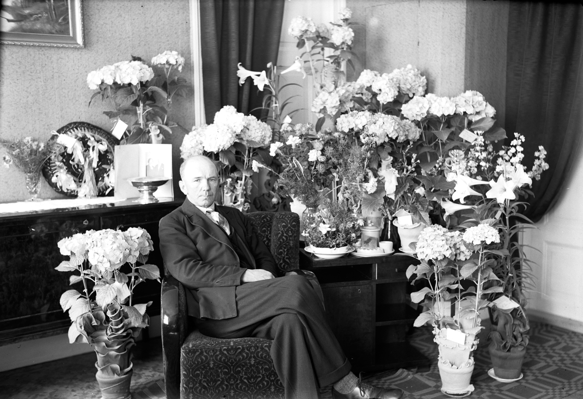 Högtidsdagen firas. Blommor och lyckönskningar är arrangerade runt omkring.