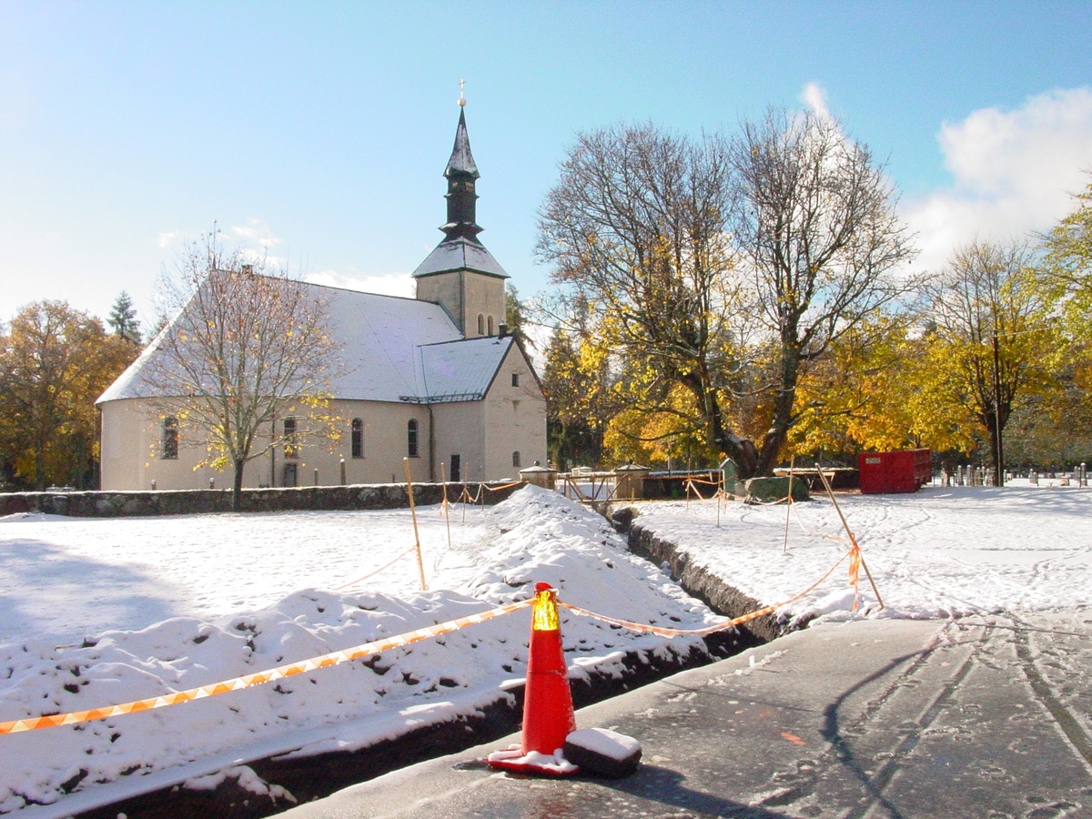 Brahekyrkan på Visingsö. I förgrunden syns ett ledningsschakt. Bilden togs i samband med en arkeologisk undersökning i och utanför kyrkan 2005.
