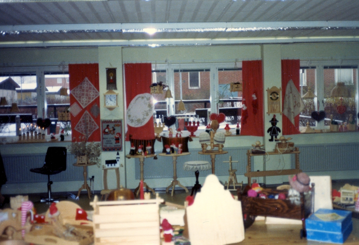 Försäljning av hantverk i Brattåsgårdens hobbylokal på Vommedalsvägen, okänt årtal.