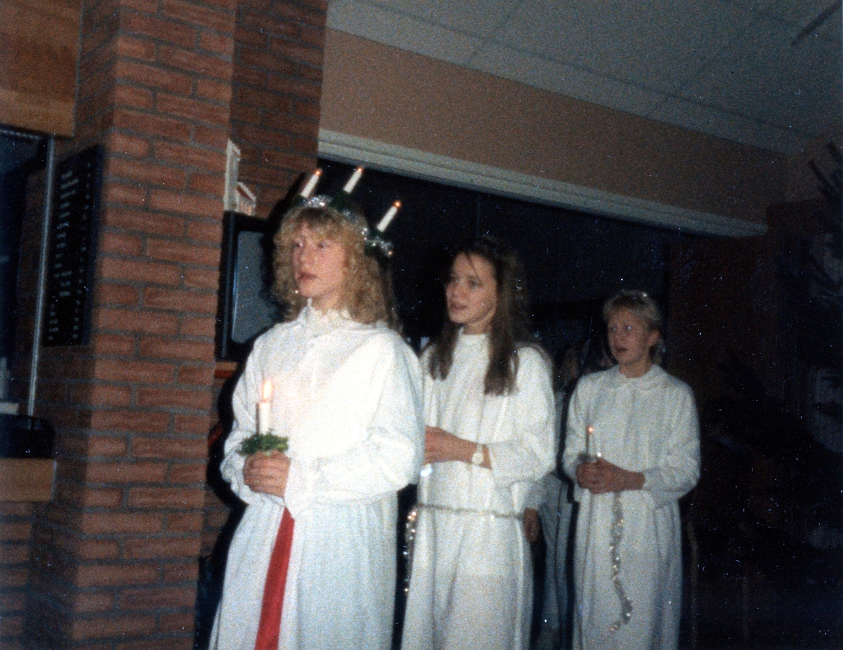 Lucia och två tärnor tågar i Brattåshemmets matsal, okänt årtal. Namnuppgifter saknas.