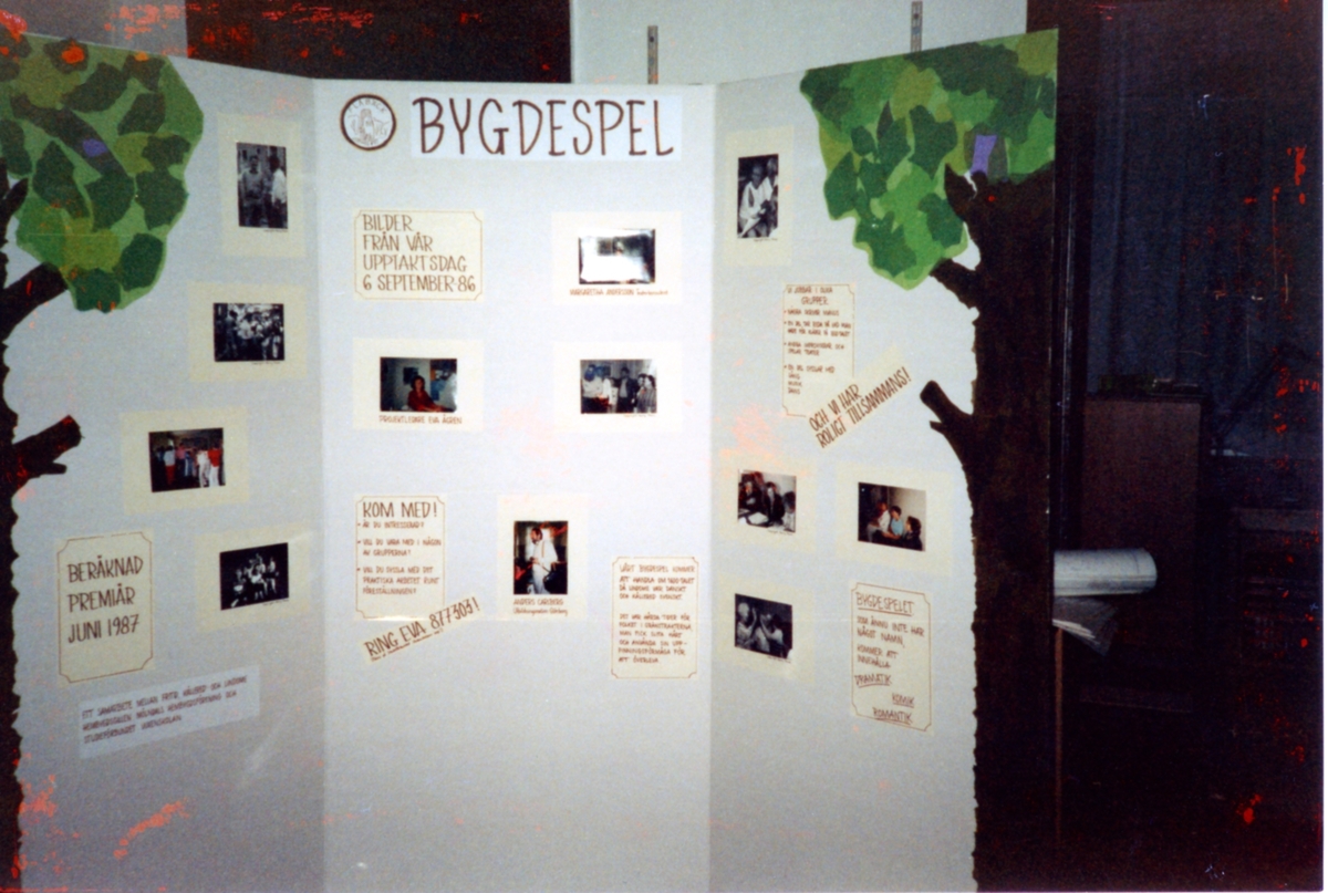 Tredelad reklamskärm med uppklistrade foton och instruktioner inför Bygdespelet "Brandskatten", okänd lokal 1986/87.