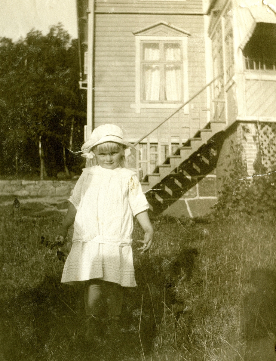 En liten flicka, klädd i kläning och hatt, står i trädgården vid Kållered Stom "Nygård", okänt årtal.