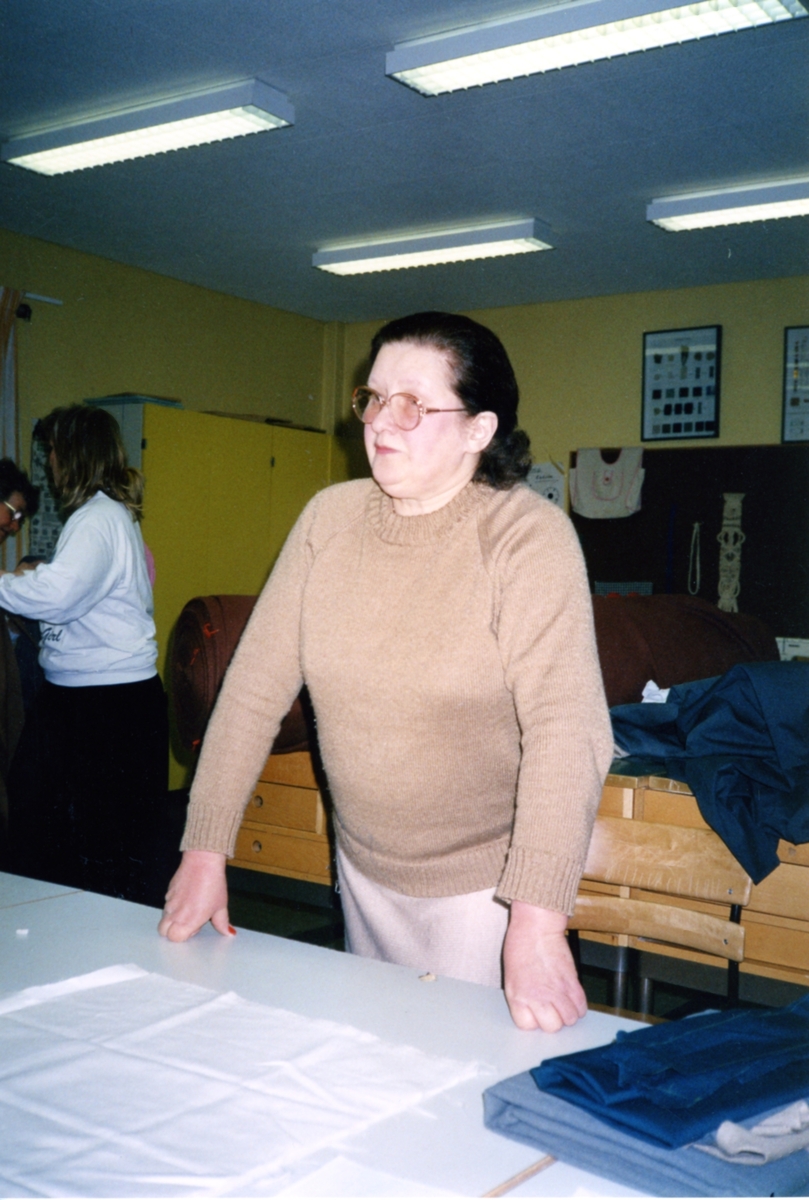Repetition inför Bygdespelet "Brandskatten" i okänd lokal 1986/87. Viola Karlsson, Kållered, står vid ett bord.