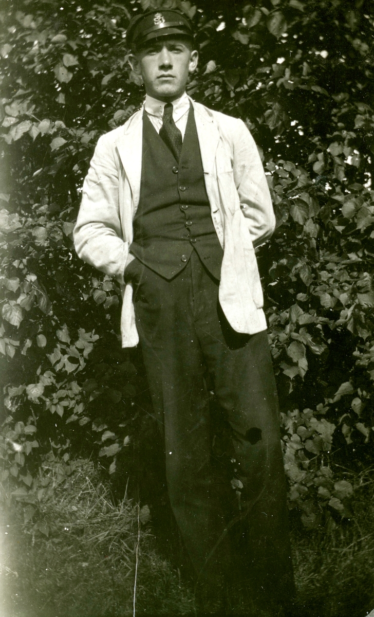 Busschaufför John Johansson (född Backen "Smen" 1898, död 1966 "Nygård"), står på tomten vid Kållered Stom "Nygård" okänt årtal.