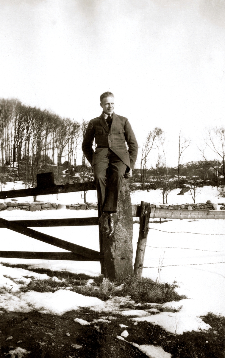 En glad okänd ung man, klädd i kostym, sitter på en grindstolpe vid gärdesgården tillhörande Kållered Stom "Nygård", okänt årtal. I bakgrunden ses ett vinterlandskap.