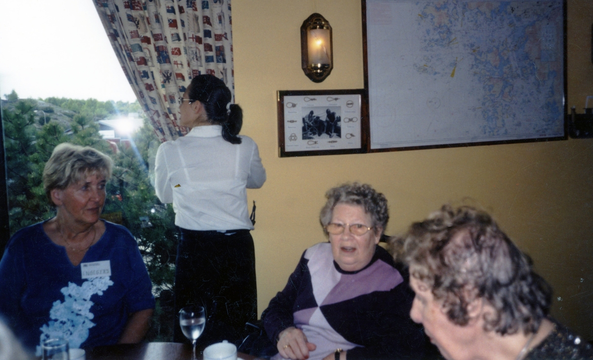 PRO Kållered är på utflykt till Önnered i Västra Frölunda år 2004. Från vänster: 1. Okänd kvinna. 2. Personal (bortvänd från kameran). 3. Marianne Hall (1929 - 2015). 4. Okänd.