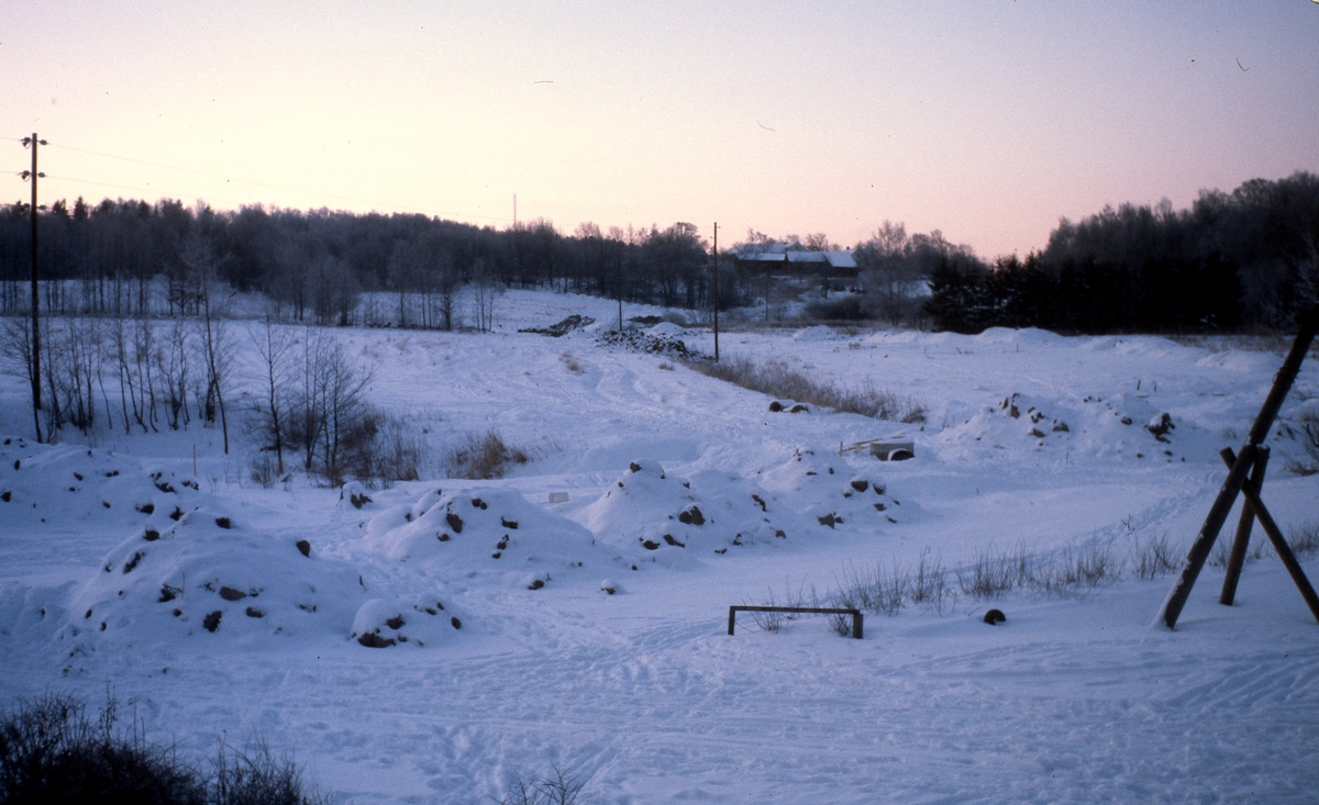 Högengårdarna ses i bakgrunden och till höger Kyrkskogen, vintern cirka 1975. Närmast till höger skymtas Vommedals lekplats.