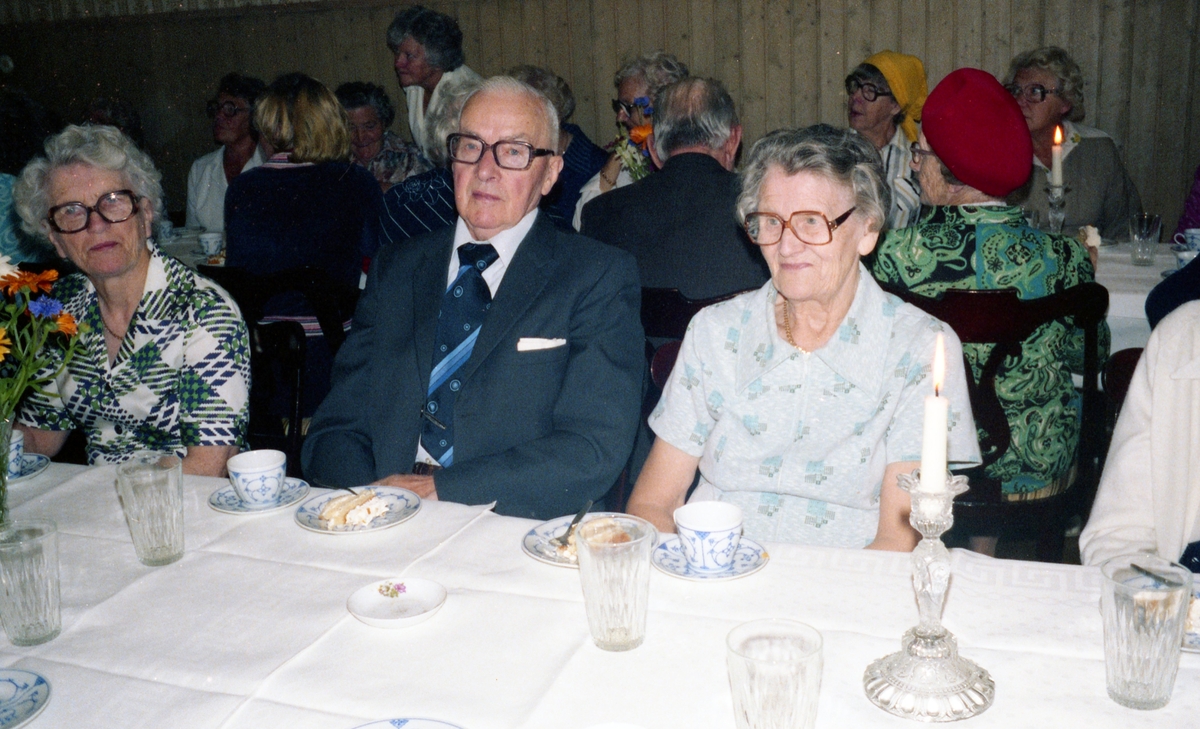 Hobbyverksamhet för pensionärer, 1970-tal. Utflykt till Resa Två Skyttlar, hotell och restaurang i Örby. Tre okända personer som sitter till bords.