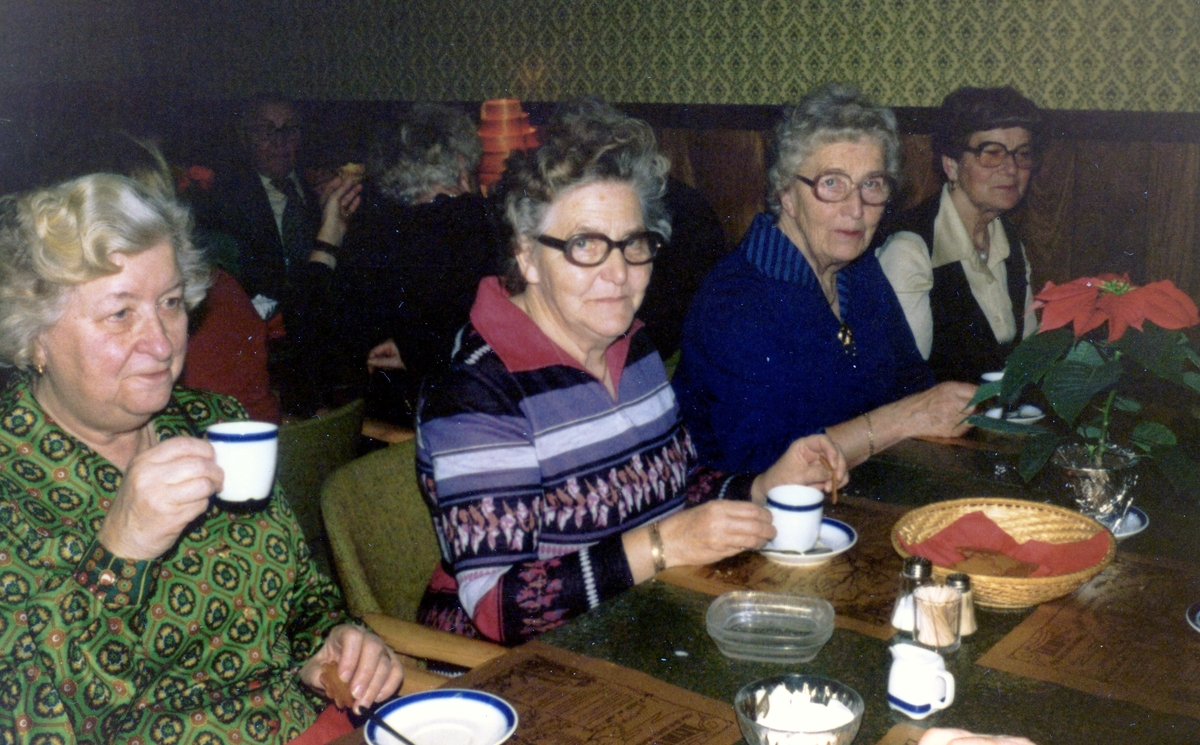 Middag och kaffe i Brattåsgårdens hobbylokal, okänt årtal. Från vänster: Berta Mattsson och Sigrid Olsson. Övriga namnuppgifter saknas.