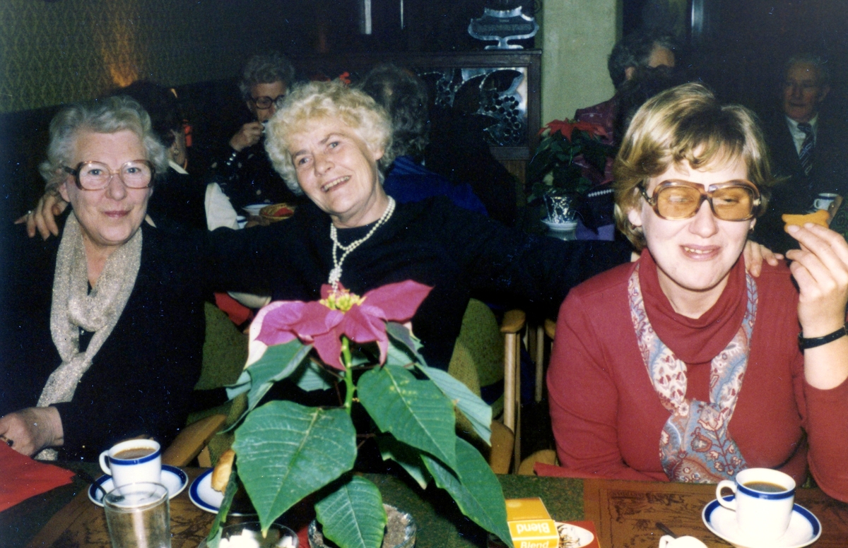 Tre kvinnor sitter till bords och dricker kaffe i Brattåsgårdens hobbylokal på Vommedalsvägen, okänt årtal. På bordet finns röd duk och röd julblomma.