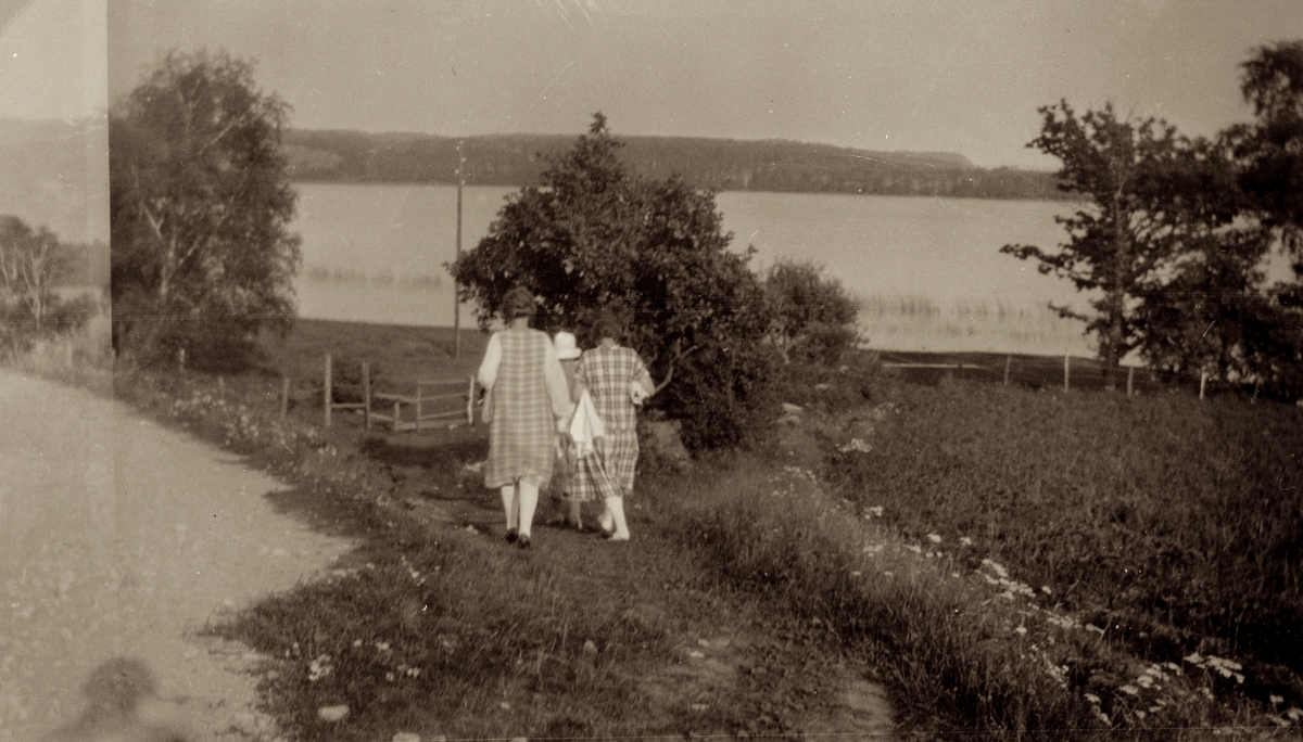 Tre kvinnor med handdukar i händerna promenerar från Stretereds vårdhem till Tulebosjön, cirka 1930.