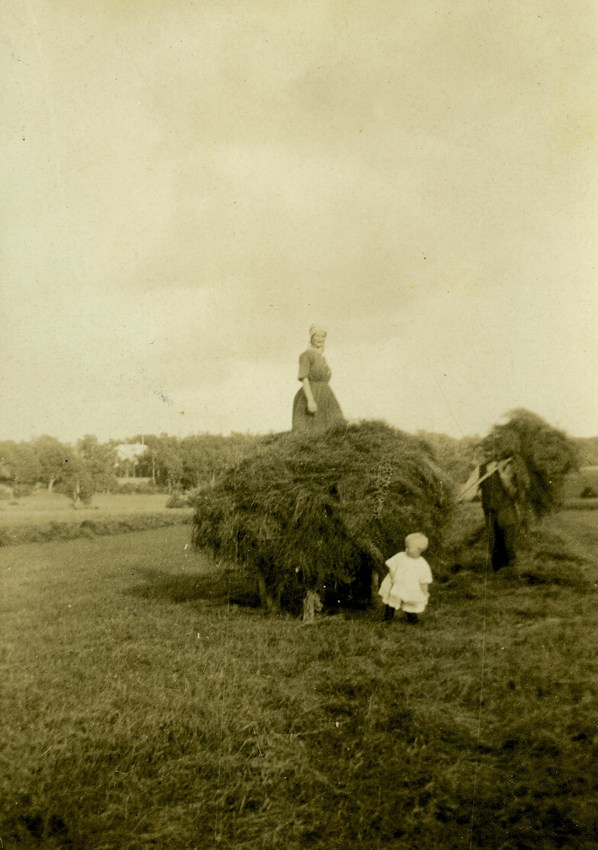 En kvinna, en man och ett litet barn lastar hö upp på en skrinda, "Majas" Livered okänt årtal. Överst på lasset står Karin Andersson.