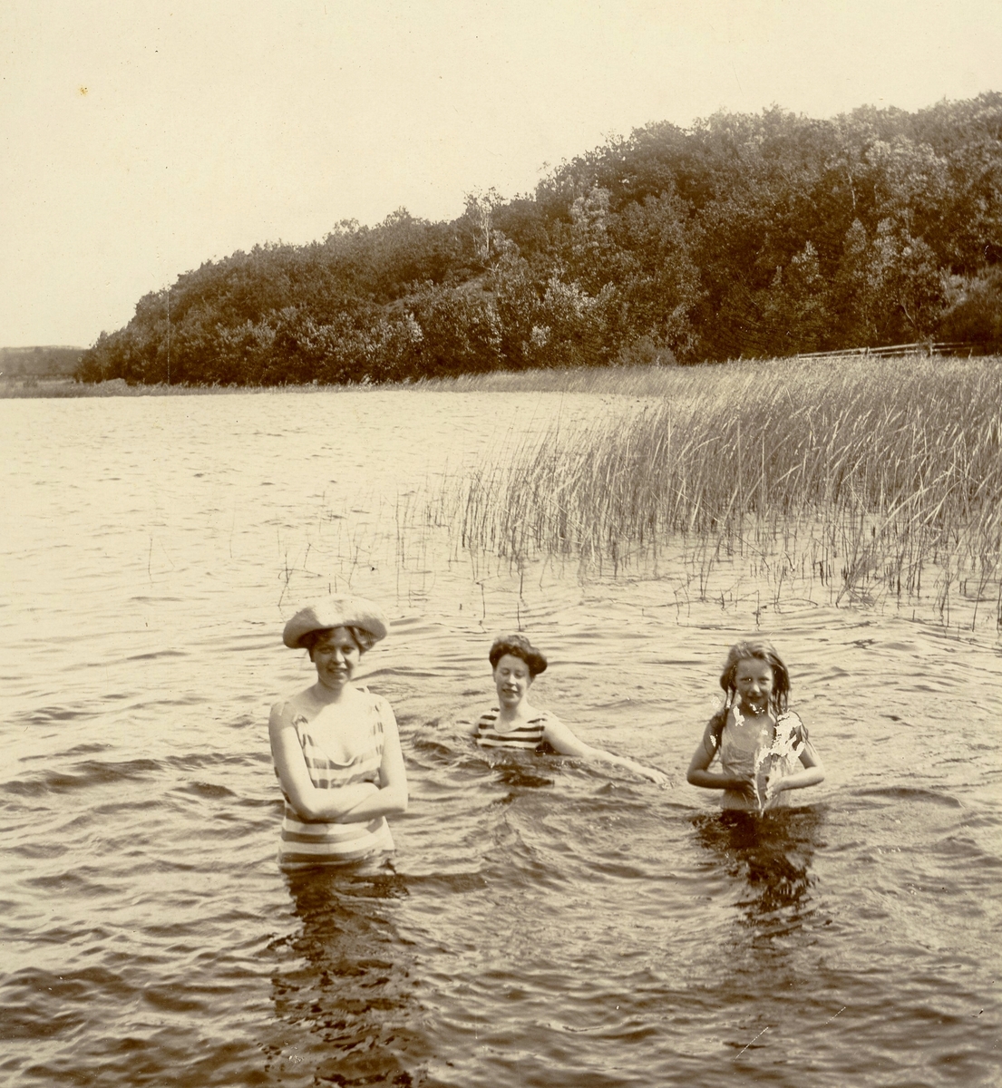 Två kvinnor och en flicka (okända sommargäster från Livered) badar i Tulebosjön cirka 1910 - 1915.