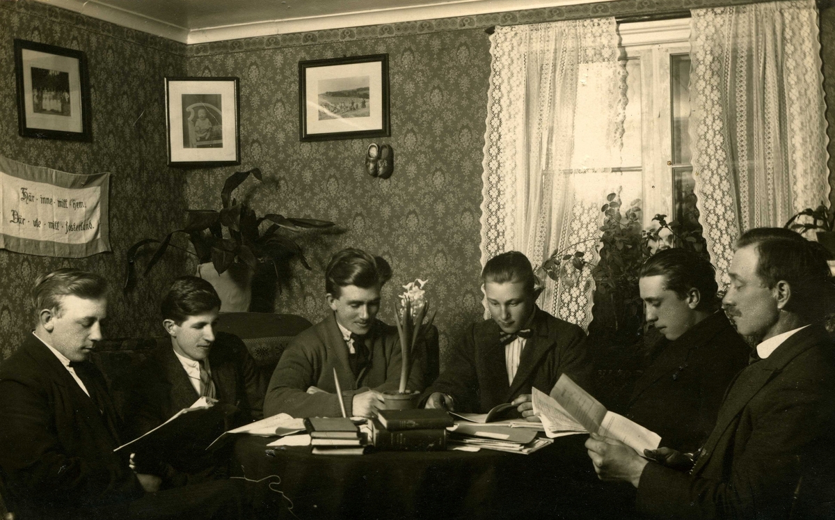 ABF studiecirkel i Torrekulla 1:25 "Alphyddan" Gamla Riksvägen 13, okänt årtal. En av deltagarna är Olof Olsson (född 1889).