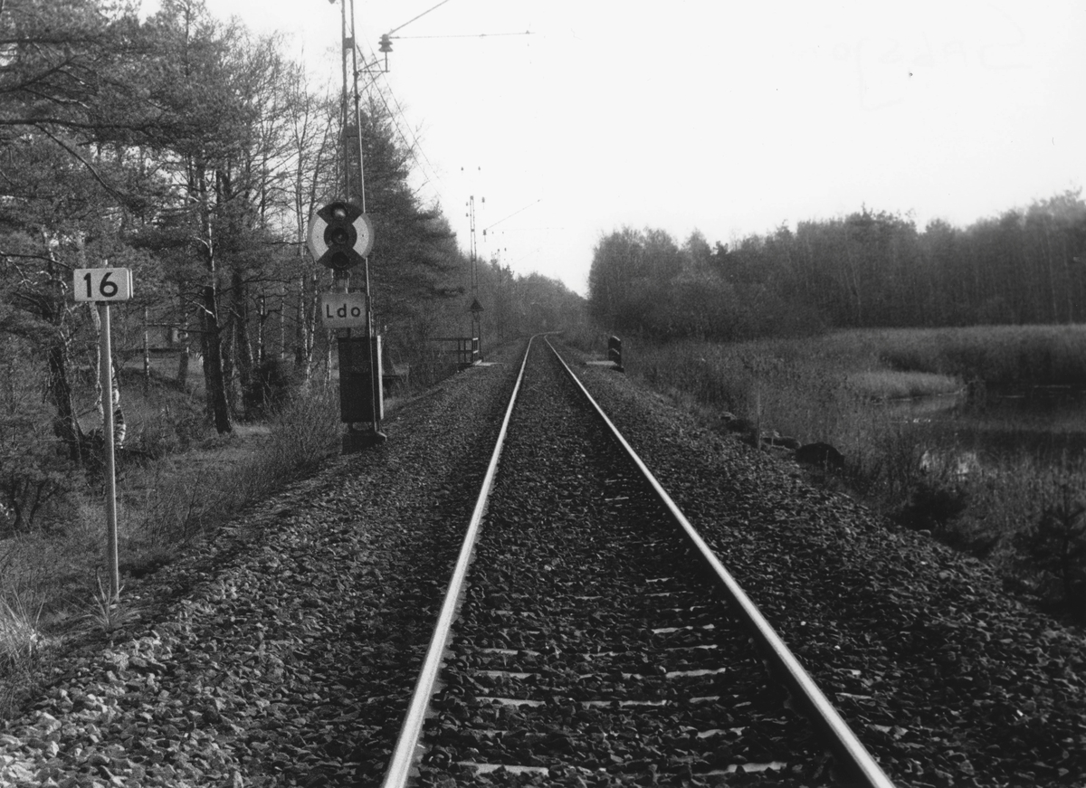 Järnvägsspår som går utmed Sagsjön (skymtas till höger) år 1989.