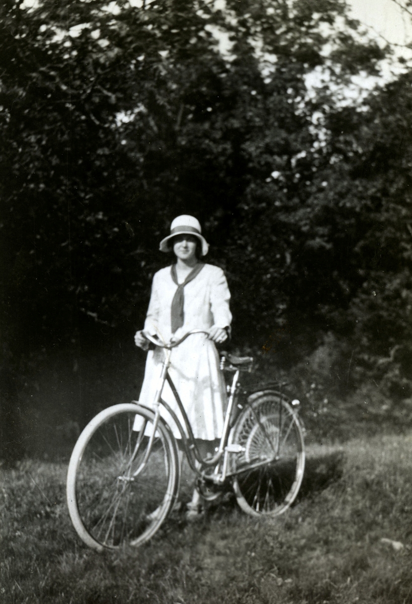 Iris Johansson (1913 - 2004, gift Persson) står med sin cykel i Livered, 1920-tal.