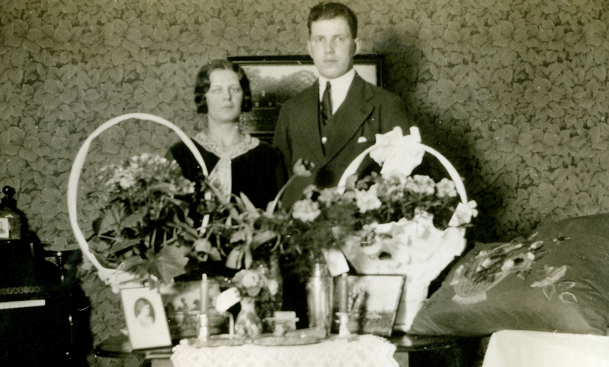 Uppvaktning för en man och en kvinna som står bakom ett bord fullt med blommor, Kållered Stom "Nygård" okänt årtal. En mönstrad tapet ses bakom paret.