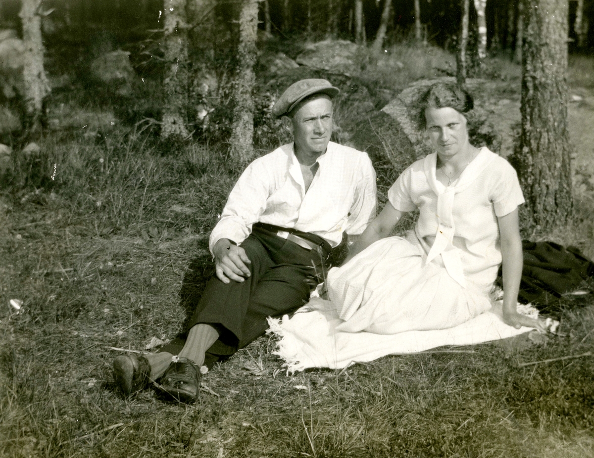 Paret John Johansson (1898 - 1966) och Ingeborg Gustavsson (1901 - 1987, gift Johansson) sitter i gräset vid Kållered Stom "Nygård" okänt årtal.